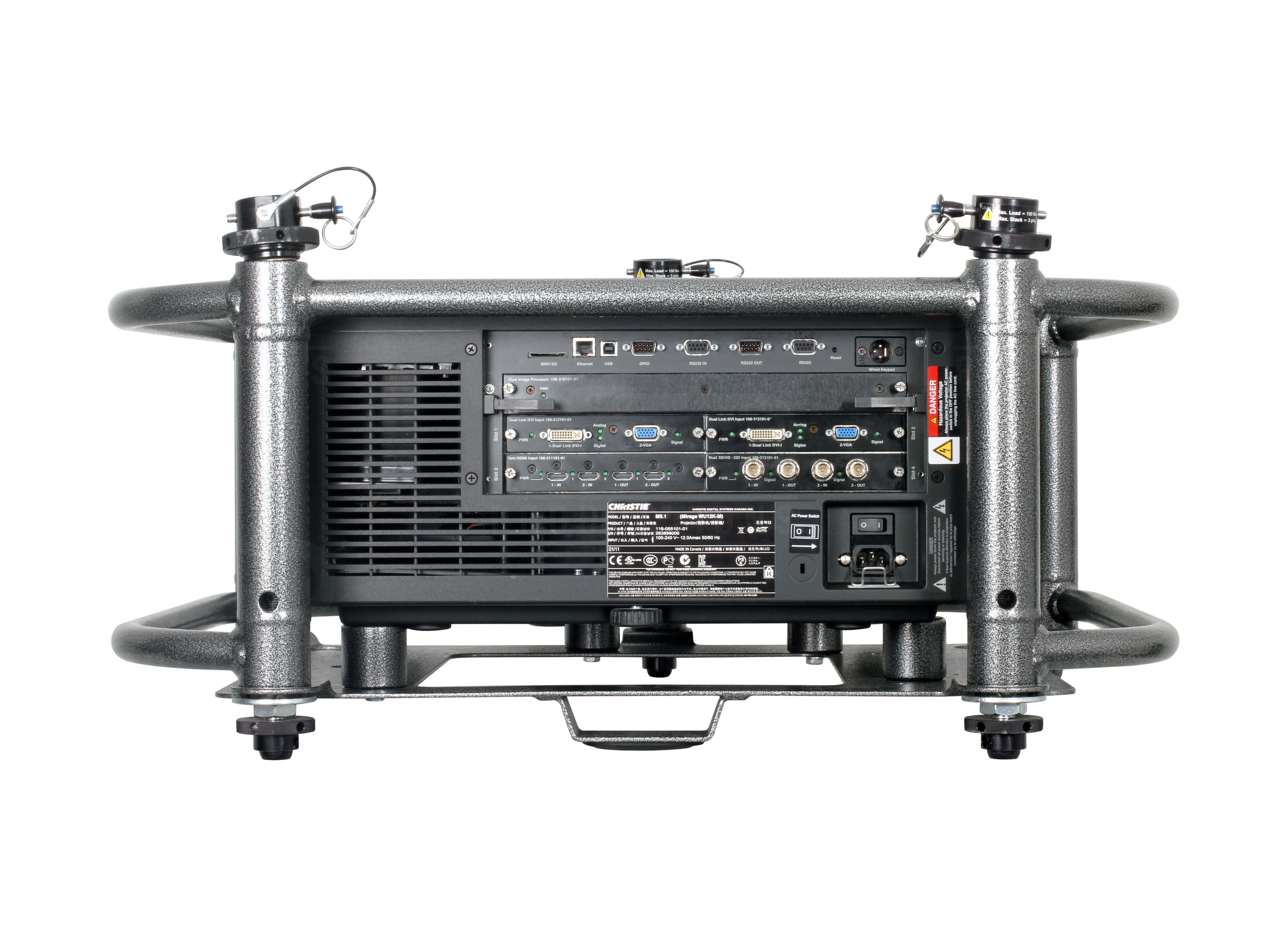 RGBHV/YPbPr via 5 BNC DVI-I - digital/analog RGB/YPbPr (HDCP) One composite video, one S-Video Two option slots for analog/digital modules 3 RS-232 ports and 1 RS-422 port On-board ChristieNET™ connectivity (RJ45) Built-in backlit keypad and IR remote control |