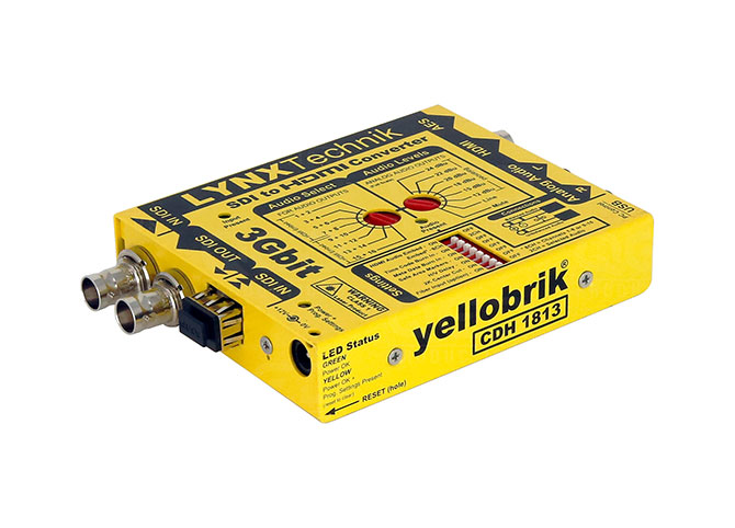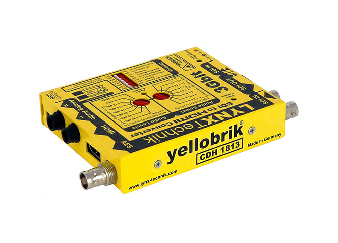 Two channels of audio can be de-embedded providing digital AES and analog audio outputs. Analog audio outputs have selectable full scale range presets. The two selected audio channels can also be embedded into the HDMI output. In addition 8 channels selected from the input signal (channels 1-8 or 9-16) can be embedded into the HDMI output. Various burn in features make the CDH1813 a true monitoring tool. Timecode burn in, 16 channel audio metering, safe area markers and Metadata display are just a few of the on-screen monitoring features. The yelloGUI software provides support for a host of additional settings and features which are accessed using a PC and the USB port on the module.