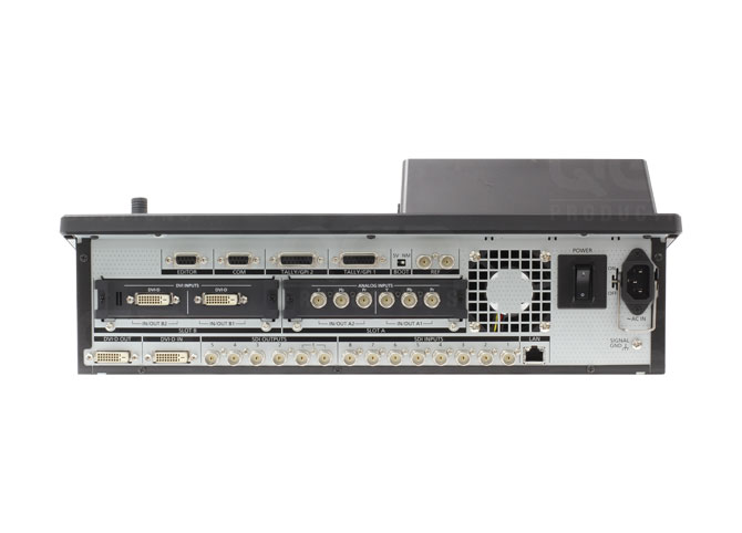 The AV-HS410 is compact and versatile with nine inputs standard (eight HD-SDI, one scaleable HD DVI-D), and is expandable using option boards to a maximum of 13 HD/SD switchable signal inputs. Five HD-SDI and one DVI-D outputs are also standard with option boards enabling expansion to a maximum of 10 outputs.