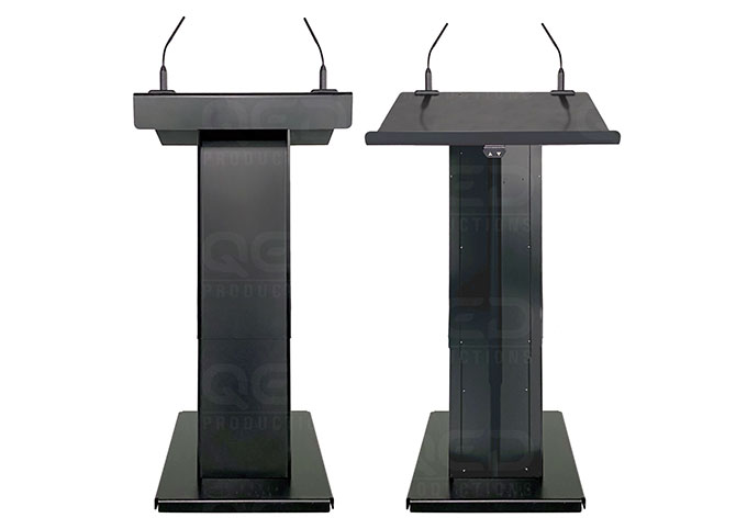 The lecterns have interchangeable aluminium panels for ease of recovering and can also be custom modified to produce different styles. The in-built microphones make each lectern a totally integrated technical facility. The lecterns transport in wheeled flightcases for protection and ease of handling.