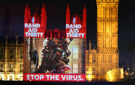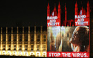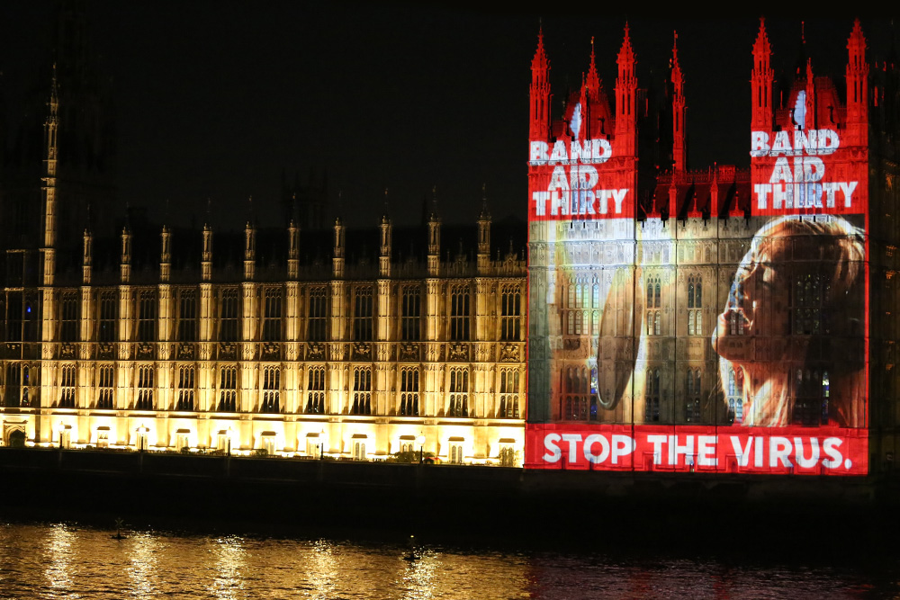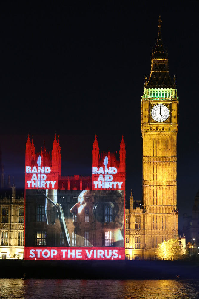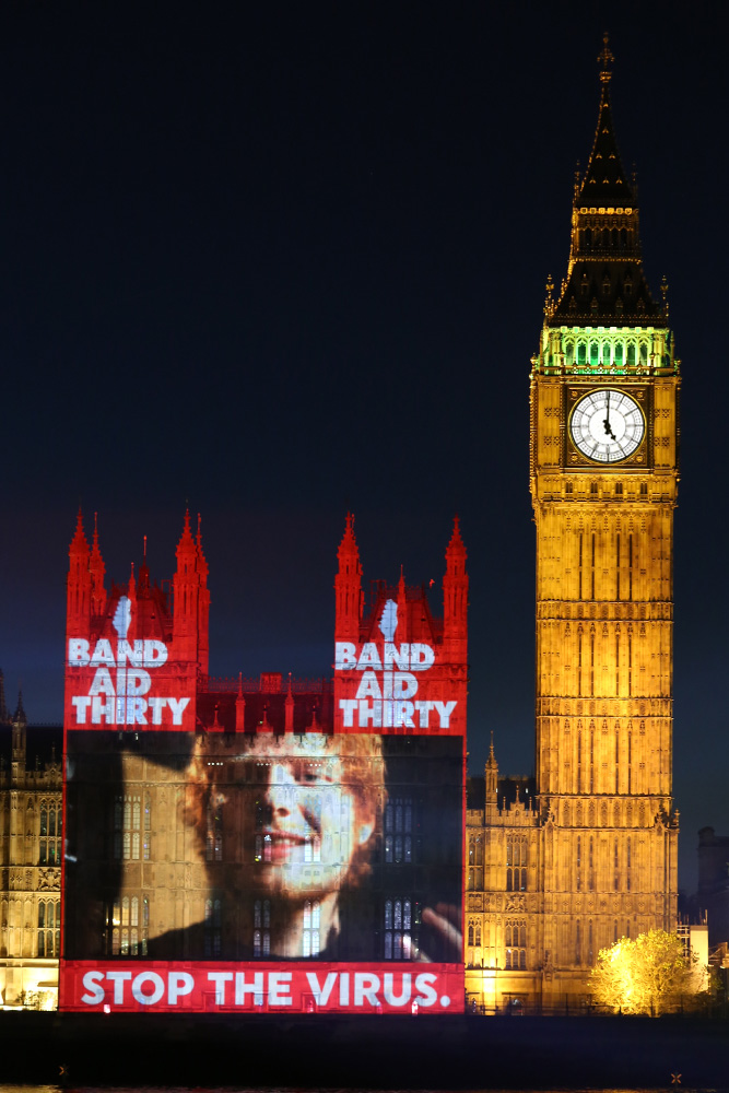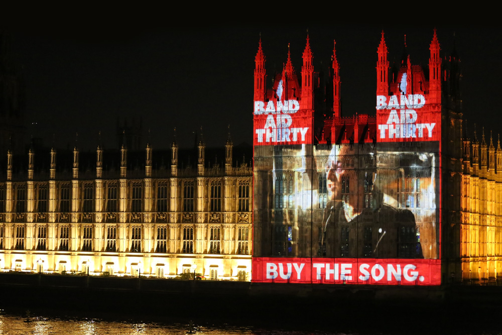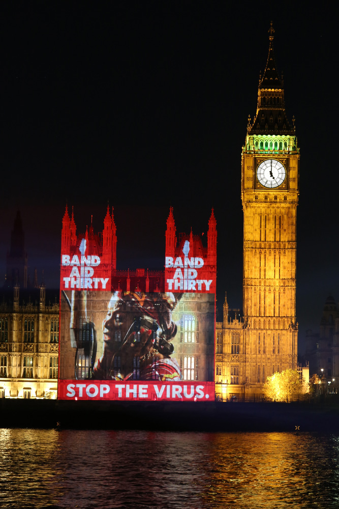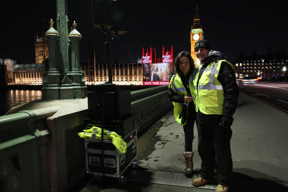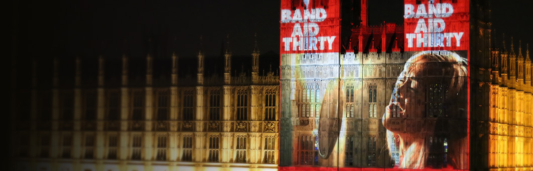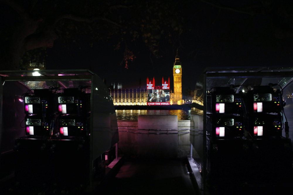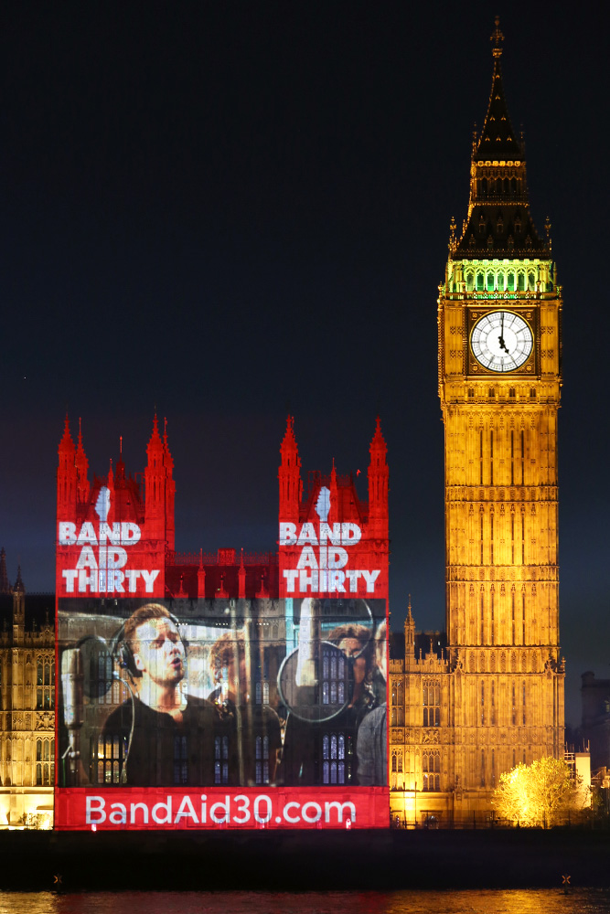 To cover the 65m high by 32m wide building required eight Christie WU20K-J 20,000 lumens projectors fitted with ultra long throw zoom lenses. Ross Ashton created a series of "place holders" in which the Band Aid 30 video was played. Using the colours, logos and strap lines of the Band Aid 30 campaign, the animated backgrounds flashed up "Buy The Song. Stop The Virus" together with the Band Aid 30.com website details.