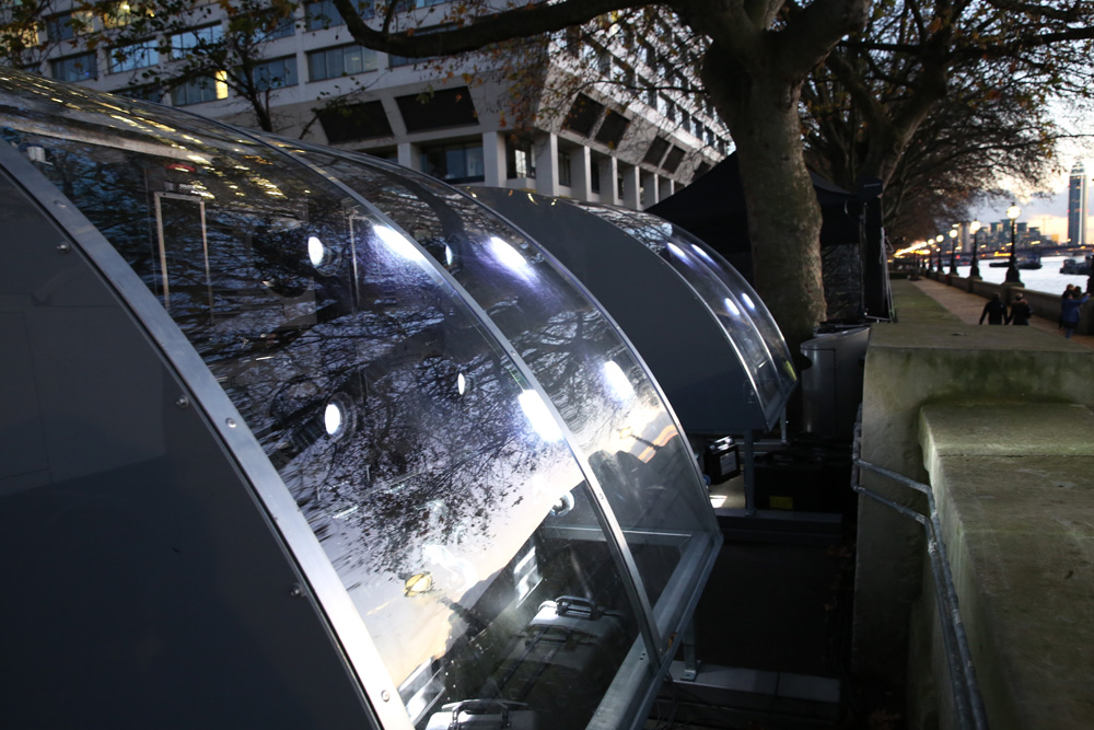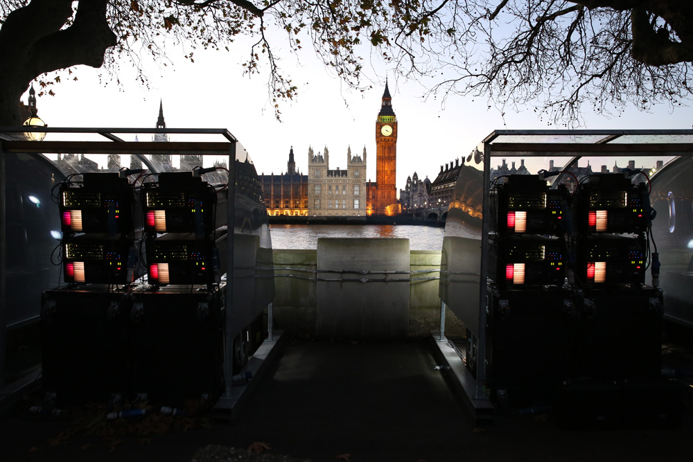"Although we have such amazing computing and projection technology it was our custom-built weatherproof projector pods that proved especially invaluable as we had to deliver a complete technical solution with only a few hours notice." commented QED Director Paul Wigfield. QED's Technical Production Manager Dave Voyce was responsible for pulling it all together including the deployment of a highly innovative wireless mobile Nexo PA system which played back the video soundtrack from locations on Westminster Bridge and on the Southbank.