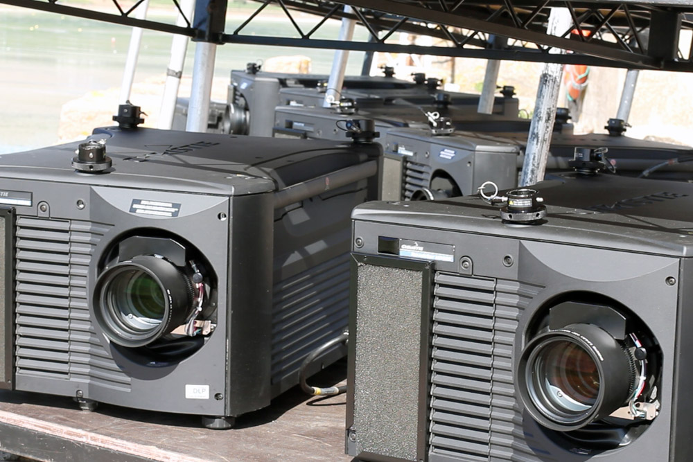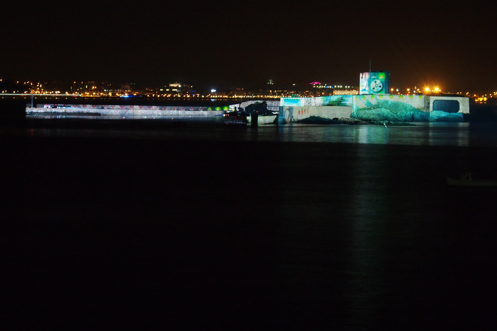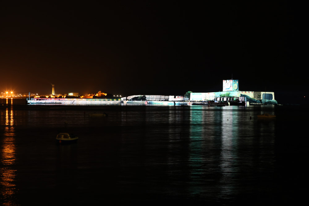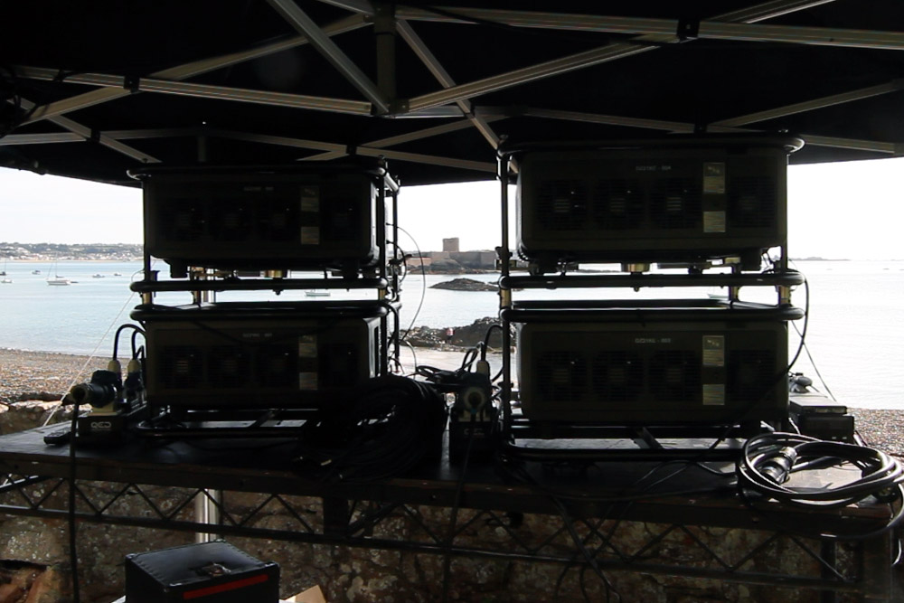 On the island the projectors were positioned so that they cross-projected onto the various faces in order to create the seamless canvas. Mains power on the fort was extremely limited so a generator was towed onto the island to run sixteen Christie HD18K 20,000 lumen projectors fitted with 1.16-1.49:1 short throw zoom lenses, and an additional generator on the shore fed four Panasonic DZ-21K 20,000 lumen projectors fitted with 8.0-15:1 ultra long throw zoom lenses.