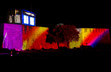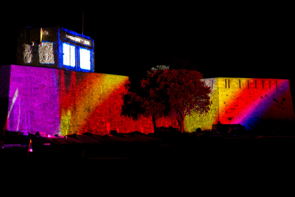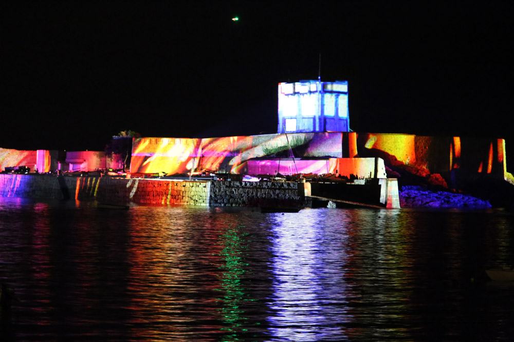 The show began with outline traces emphasizing the architectural features of the island and animated blocks of colour representing the flags of France and the UK. Taking reference from the opening musical credits of Dr Who the main fort tower was then transformed into the Tardis whereupon the audience were taken on a journey inside it where historic footage from the Jersey Film Archive was mixed with the retro-futuristic animations of the working interior of the Tardis.