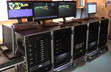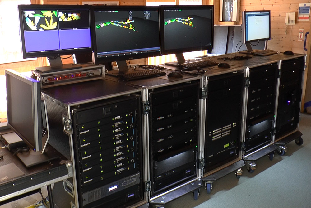 The AV control comprised two d3 4x4pro and four d3 4u v2.5 media servers, two Lightware FR-33 32x32 DVI matrix switchers and two QED/ThinkLogical 15-channel fibre systems with on-board output monitoring on all channels provided by two Harris Predator II 16-input DVI multi-viewers. Gigabit fibre control enabled the projector line-ups to be done remotely from all positions around the island and on the shore.