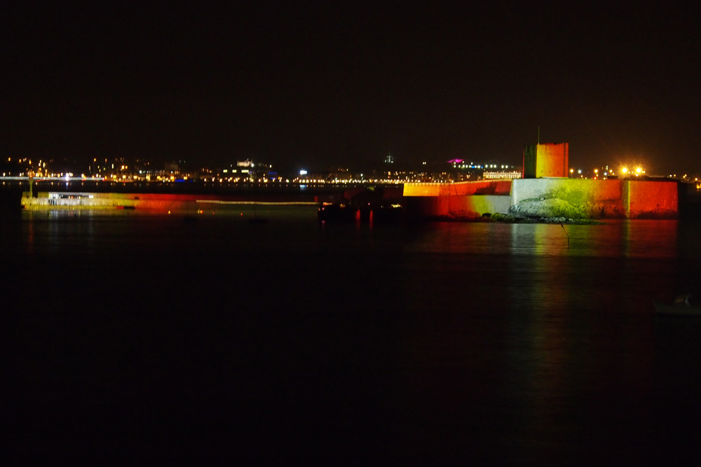 According to Dave Voyce "Working around the tides was a unique experience - with no opportunity to test the viability and integrity of the link in advance we needed a totally robust solution to withstand the undertow - so we just had to get it right first time. We made as much use of the causeway as possible, drilling multiple fixings for secure anchorage, and then running the cable up the harbour wall and along the quayside to the second control position on the roof of the Yacht Club. We laid 5km of fibre multi-core cabling to link all the projectors with signal and control, providing nearly 30km of fibre channels all in all.