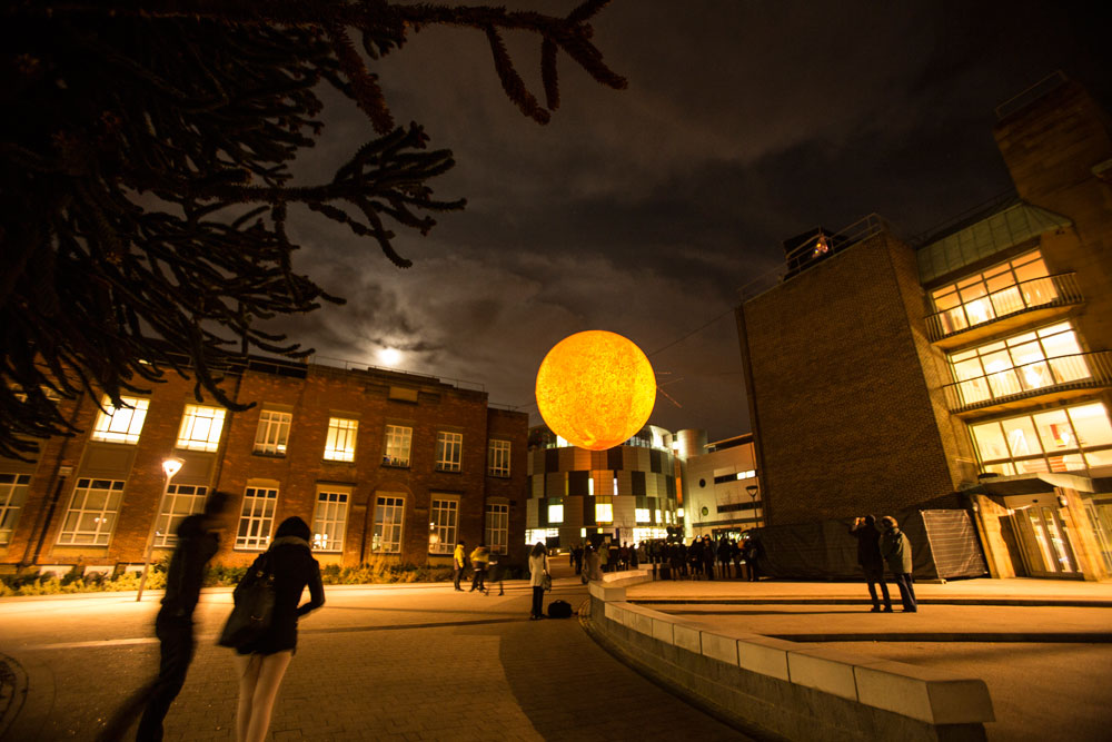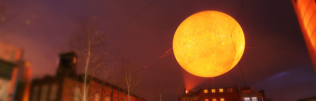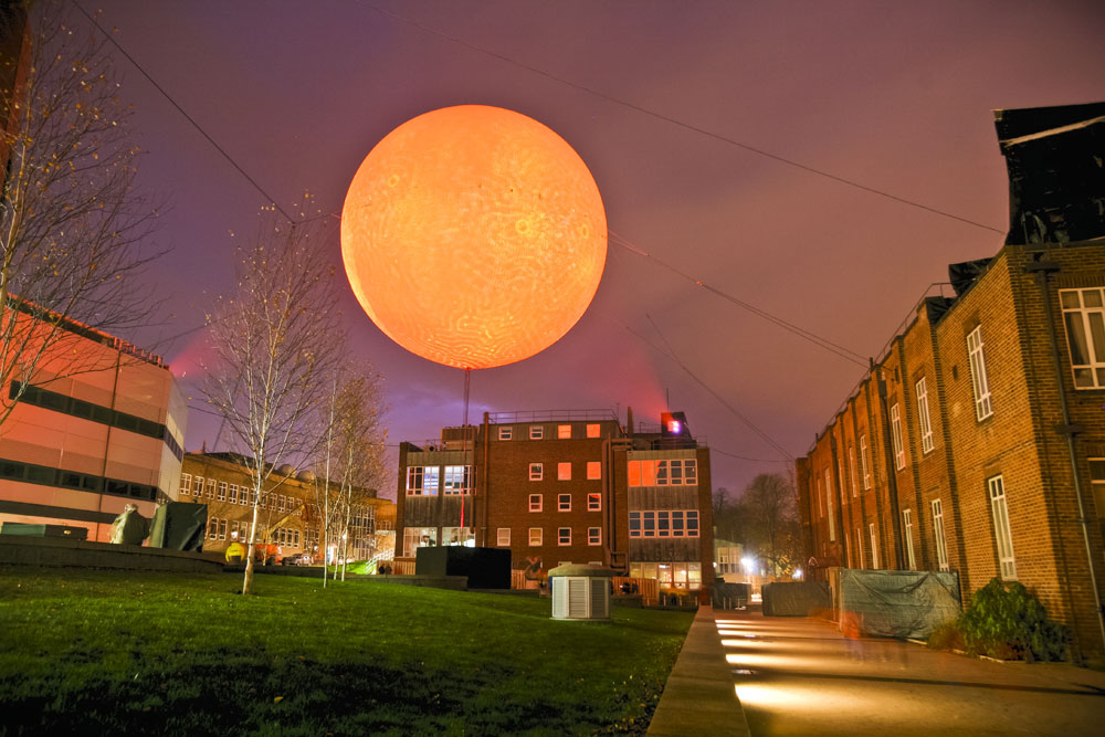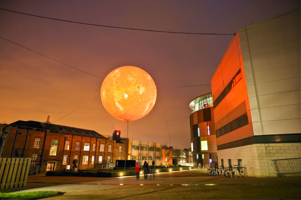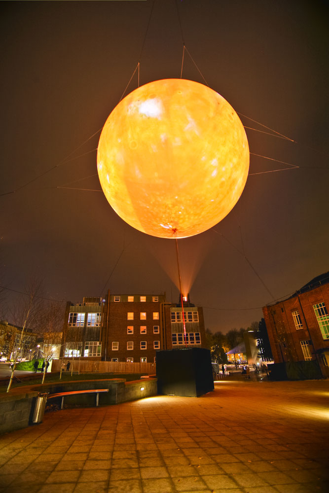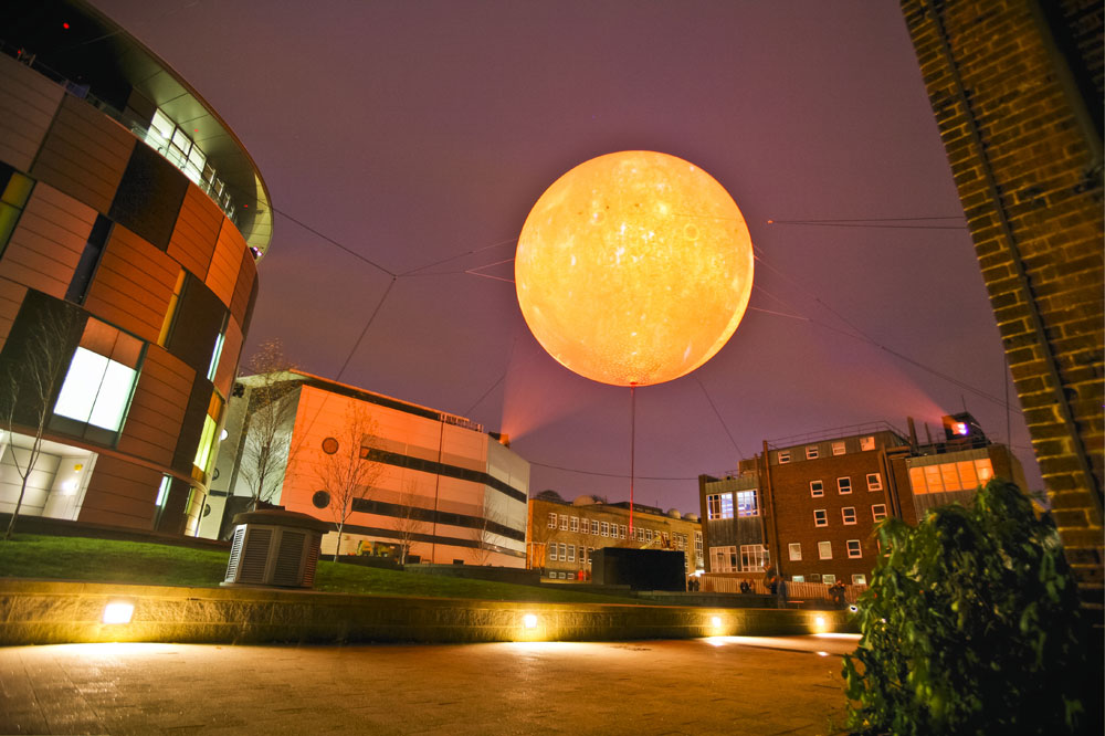For Lumiere the 14m diameter balloon was tethered over Durham University's Science Site and projected upon by ten edge-blended Christie WU20K-J 20,000 lumen WUXGA projectors. The projectors were installed in weatherproof housings on four surrounding rooftops with two mounted directly underneath the balloon. All the sites were linked back to the control centre via QED's bespoke multichannel fibre optic system which provided both DVI signal and network control together with output monitoring on all channels.