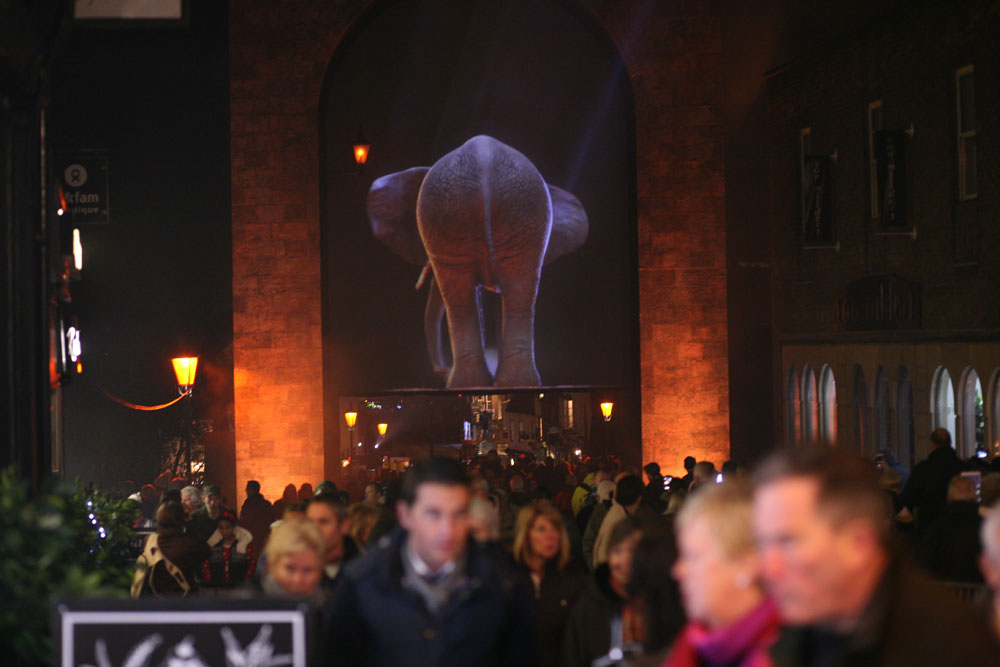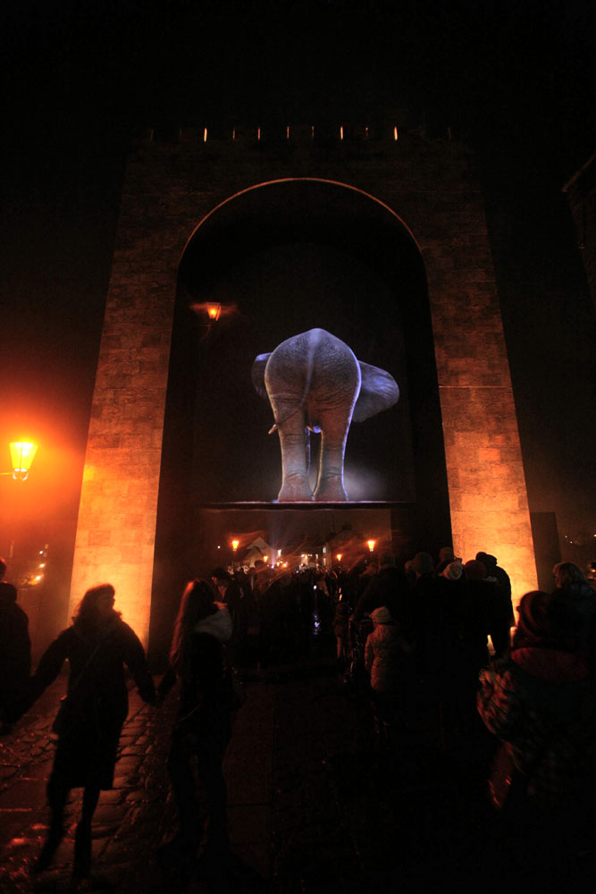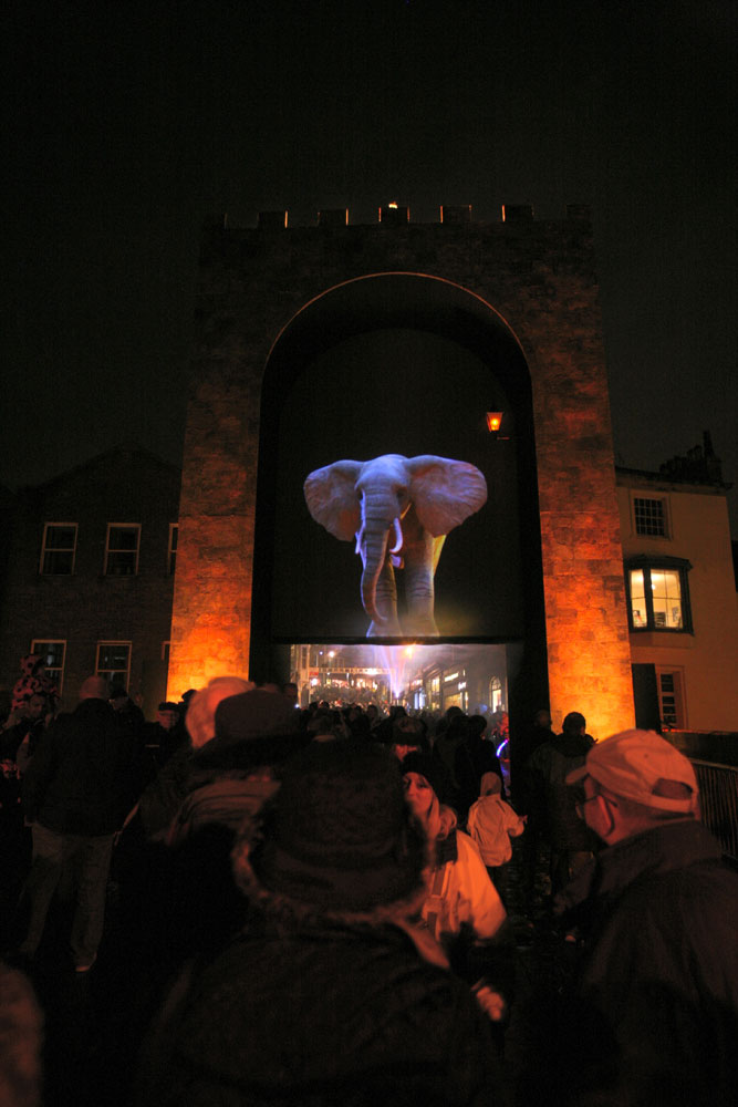 The projection was set on Elvet Bridge, and housed in a specially constructed arch suspended above the ground which allowed visitors to walk underneath. The front of the elephant was projected on one side of the archway and the rear was projected onto the other side using two Christie WU14K-M 14,000 lumen WUXGA projectors, with the content played back from a QED Watchout server system.