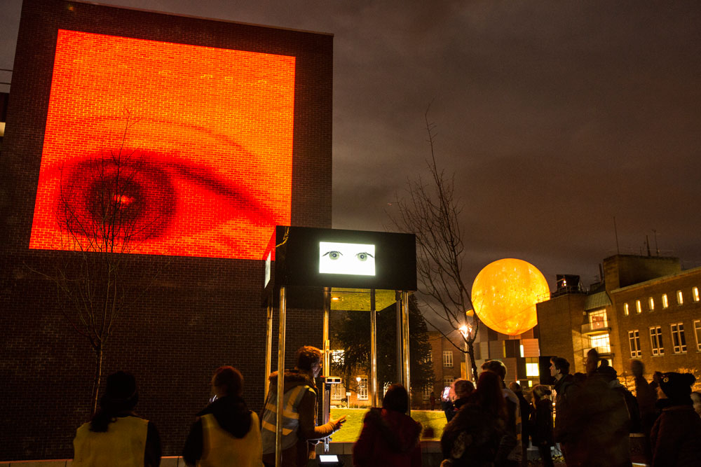 Art meets science in this investigation of the eye and its relationship to the human body. I is a large-scale installation that uses bio-medical imagery of eyes to make a beautiful, dynamic artwork. Audience members were invited to interact with the work, experiencing and adding to it with scans of their own eyes. Despite the dark red brick surface only a single Christie HD18K 20,000 lumen HD projector was required to display the artwork at stunning brightness onto the façade of the Bill Bryson Library at Durham University's Science Site.