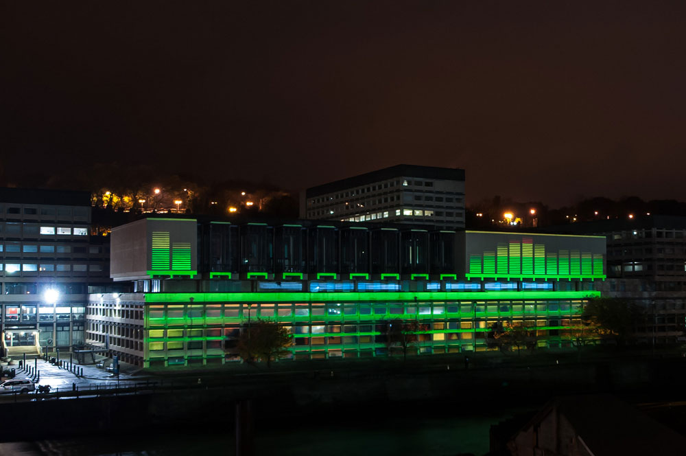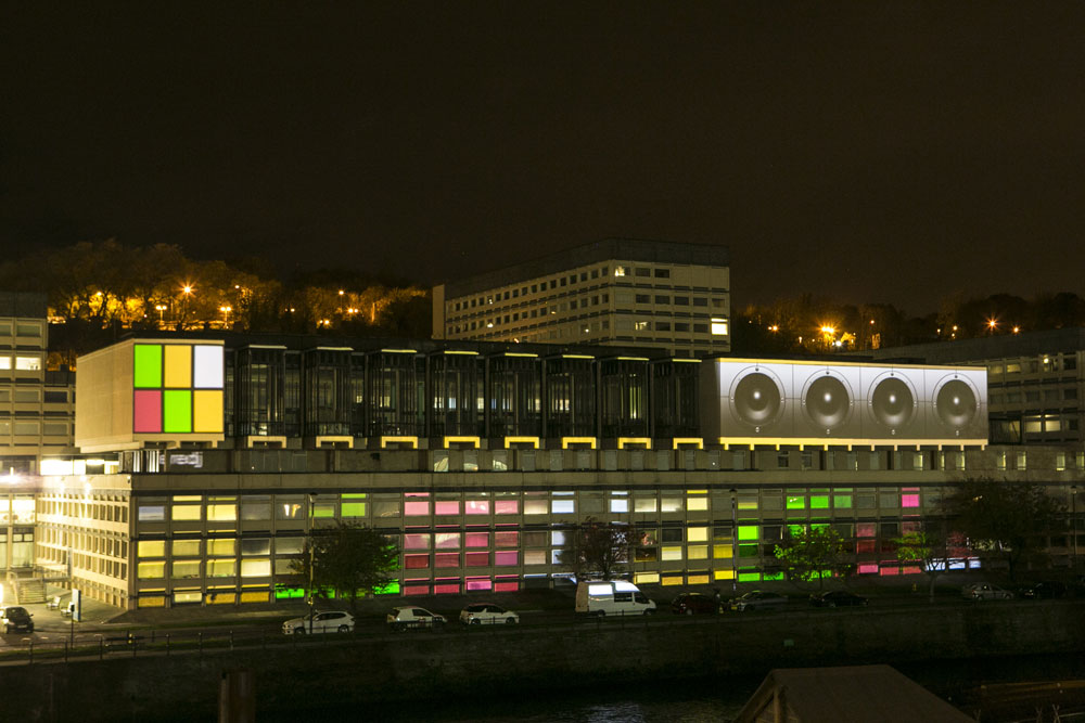 This interactive projection transformed the exterior of one of Durham's least loved buildings, the 1960s Milburngate House, into a visual jukebox. Live video DJing projections and music selected by audience members tweeting their requests brought the building to life with a variety of sound responsive images and graphics.
