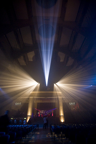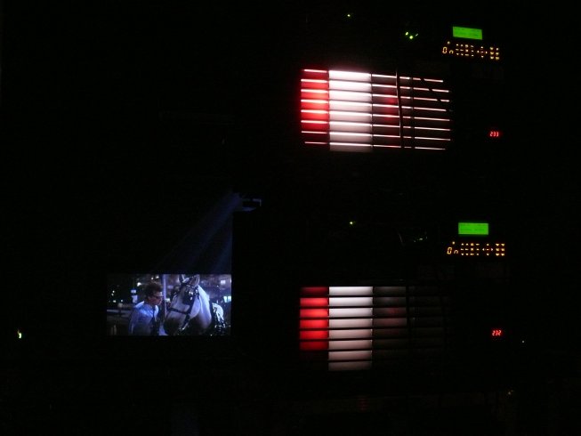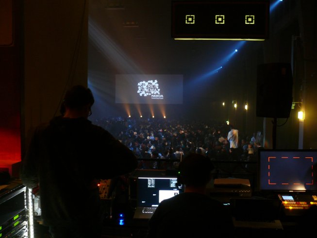 The Christie HD12Ks were the ideal choice of projector, providing the highest amount of brightness possible from the limited power available on-site. The HD12K delivers 12,000 ANSI of brightness from just one 13amp supply. At this scale, and with the audience so close to the screen, the doubling had to be absolutely pixel-perfect in order to maintain the sharpness of image. Precise physical positioning and geometric correction was aided by wireless projector remote control via a Samsung Q1 wi-fi notebook PC and HME WH200 wireless talkback headsets. With 1,000 people about to arrive within the hour the benefits of reliable wireless communication and wireless control were immense, especially at a time when the room was full of atmospheric fog which meant that the screen was only viewable from right up close.