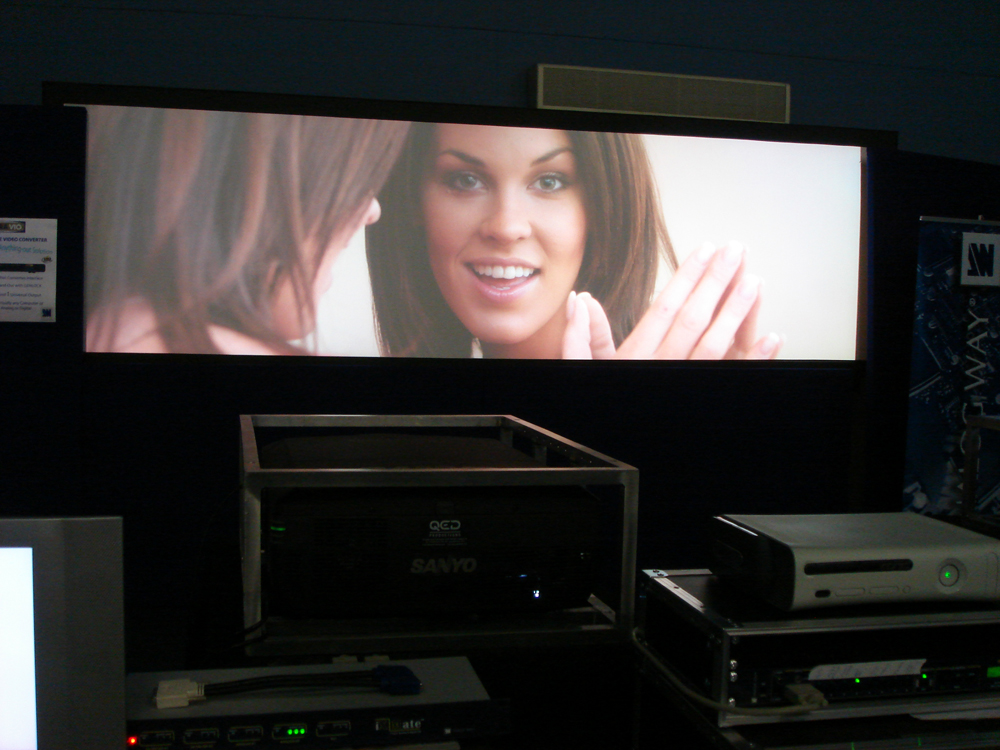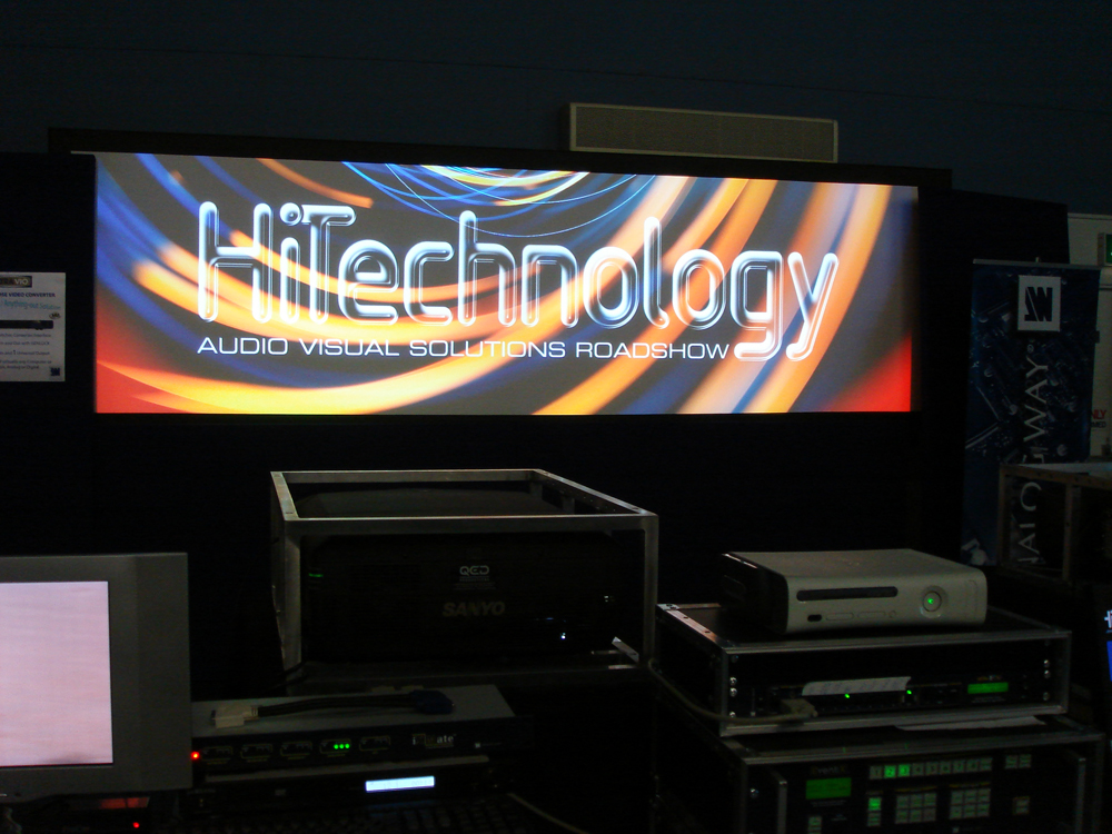Using QED's Sanyo HD-10 projectors Analog Way demonstrated the high definition edge-blending capabilities of Diventix at the recent Hi Technology roadshow organised by Midwich and True Colours.A high specification multihead PC blended at HD provided the ultra high resolution canvas for the background images with true HD playback from a specialised HD media server. The perfectly matched projectors provided a seamless 3456 x 1080 resolution image. With only one overlap the two 16:9 high definition projectors were able to be edge-blended much more easily than using three 4:3 projectors and provided all the vertical lines of resolution necessary to show all HD sources.
