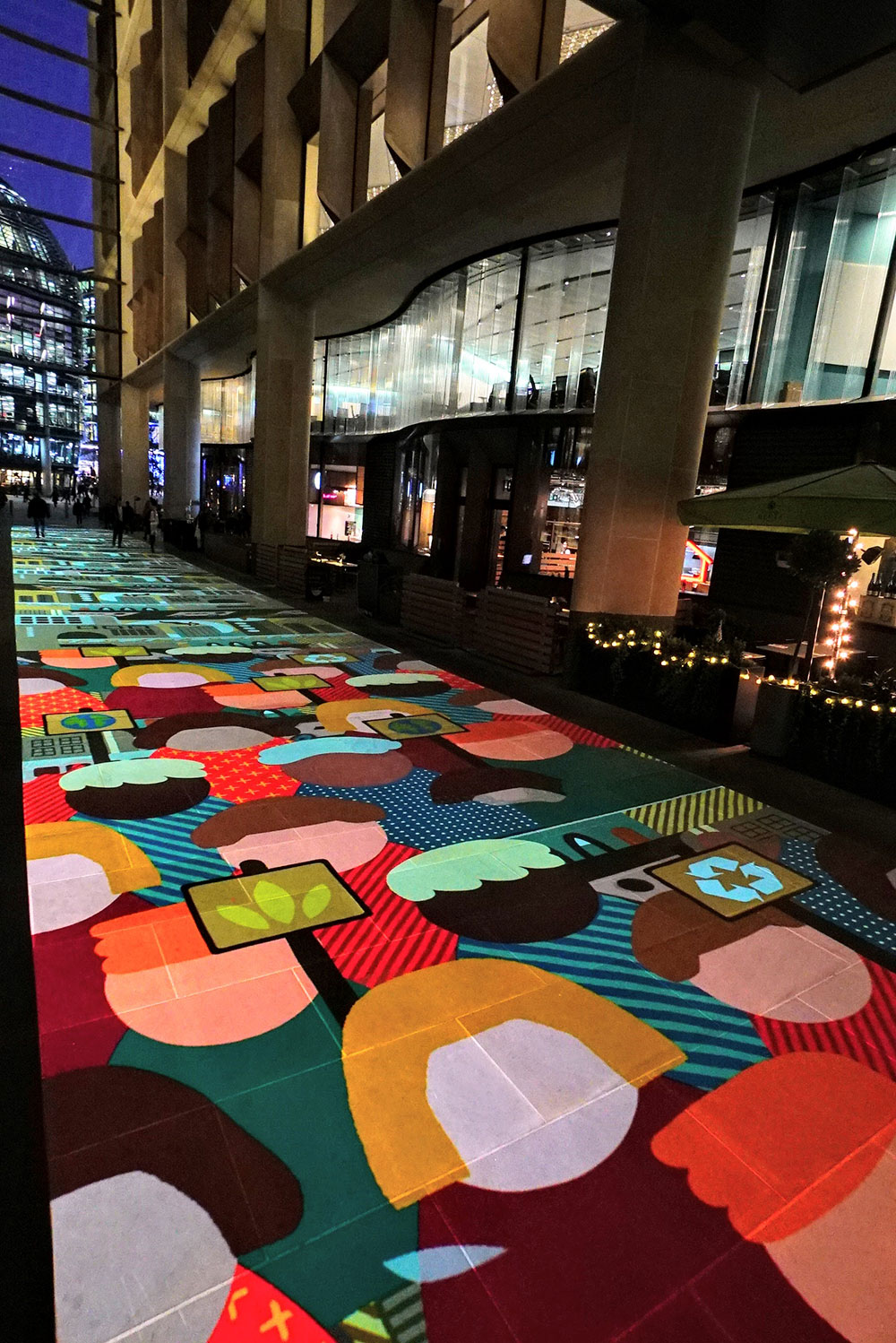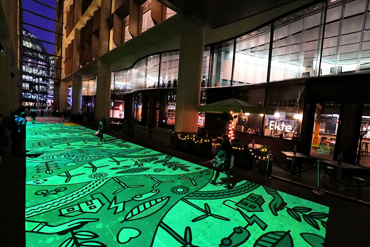 The projection was delivered using seven blended Panasonic RZ21K 20,000 lumen laser projectors mounted on the top of seven 7m high towers, projecting downwards at an extremely sharp angle onto the walkway. The projectors were chosen because of their high brightness, low power consumption and proven track record of reliability.