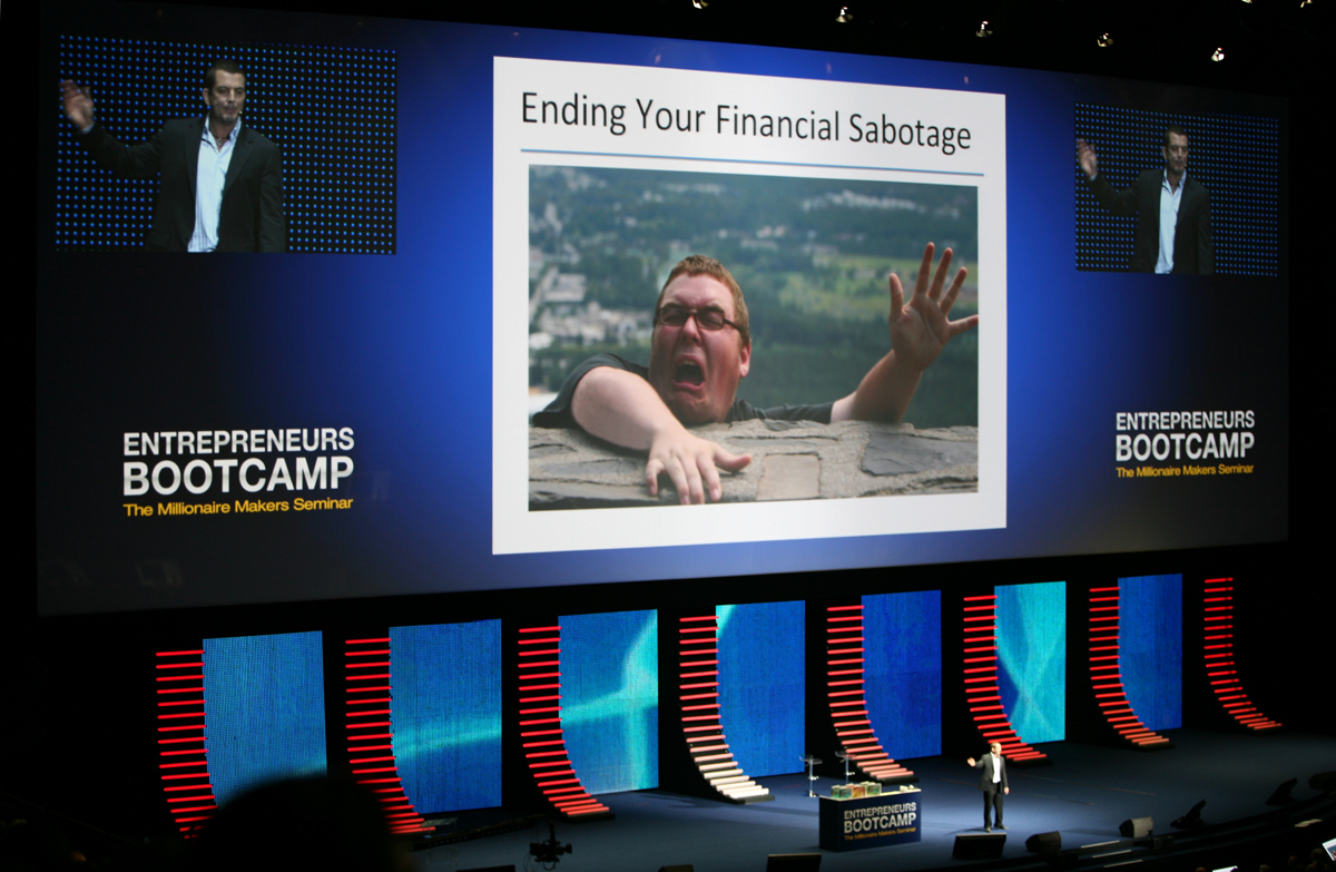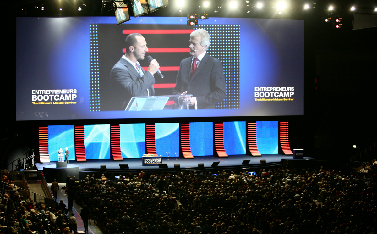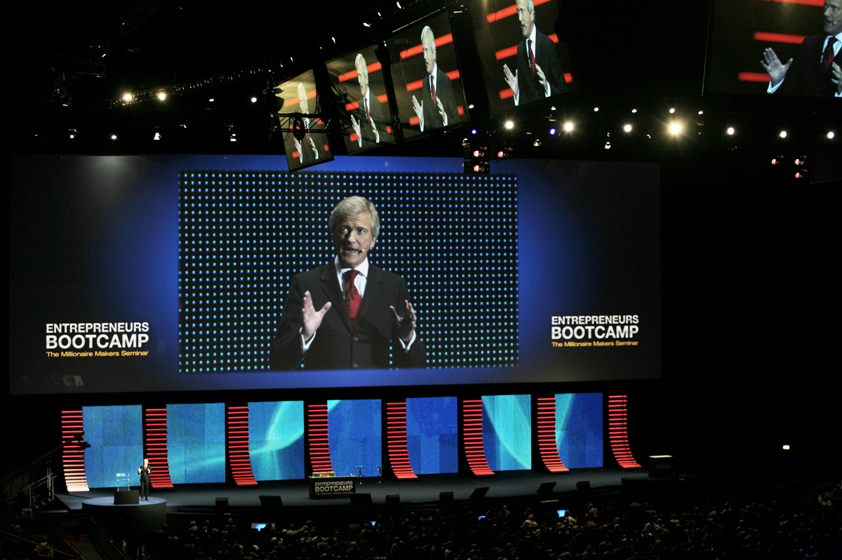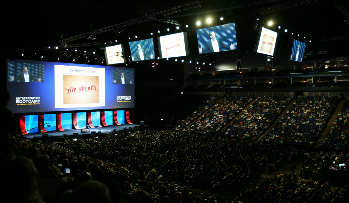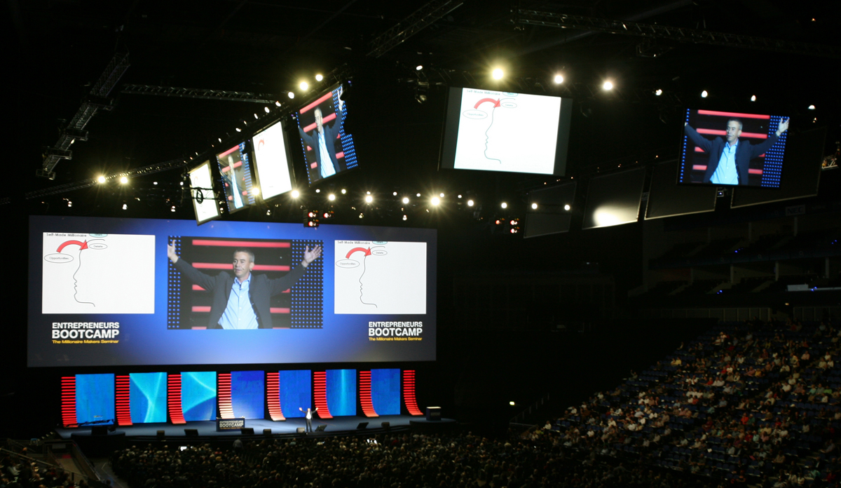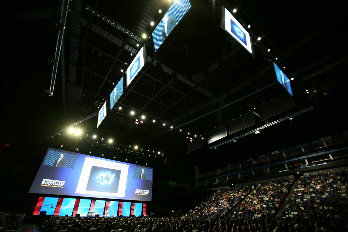 QED was able to set several technical milestones when the 2009 Entrepreneurs Bootcamp came to London's O2 Arena. The brief from event producers, Smyle Creative, was to provide the biggest projection display ever seen at the 15,000-capacity venue, and QED duly obliged, filling the massive 35m wide by 12m high projection canvas by deploying six Christie Roadster HD18K projectors flown off a 25-metre high truss high above the audience.This tour de force enabled a host of motivational speakers (including Bootcamp founder Andrew Reynolds) to address aspiring entrepreneurs in an event held annually by the millionaire. This was the first time it has taken place in the iconic Docklands venue, the largest indoor arena in the UK. Once the venue had been chosen the idea was to make the production as large and as impressive as possible. Although QED has projected onto wider surfaces in the past it had never attempted anything of this size indoors. The 410 square metre screen is over 100 square metres larger than previous largest indoor projection screen in the UK. The size of the screen was so large that it could not be assembled at ground level and flown into position, so it had to be built vertically in-situ in individual sections. The screen occupied so much space that it severely restricted the size of the cherry pickers that were able to enter and exit the arena. There was simply no more space left in the 02 to accommodate any larger screen. The amount of clear air space that the projectors required in order to fill the screen also presented Smyle with a massive technical challenge in terms of designing and deploying both lighting and sound, and with only one day to set up the whole event the technical rig required military precision planning and execution.
