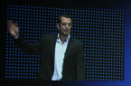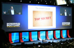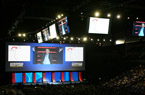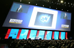 Projecting a 2.8:1 aspect ratio image, QED used six HD18K 1080 HD High Definition DLP projectors, arranged in two triple stacked blended pairs. 105,000 ANSI lumens of projected light output was required in order for the screen to really stand out amongst all the LED, stage, camera and audience lighting. The main rig comprised a 15-way matrix, set around two Vista Spyder 344 video processors, and included everything from computers showing PowerPoint and Keynote content, HD cameras and even a visualiser OHP. Spyder's picture-in-picture windowing facilities were used to introduce individual speaker content within the context of the overall display. Three Analog Way DiVentix units provided the on-stage source matrix, the flown screens with a two way matrix, and a single mix for the OB truck - all controlled by the Spyder system.
