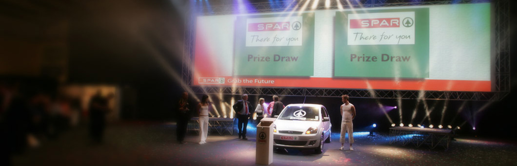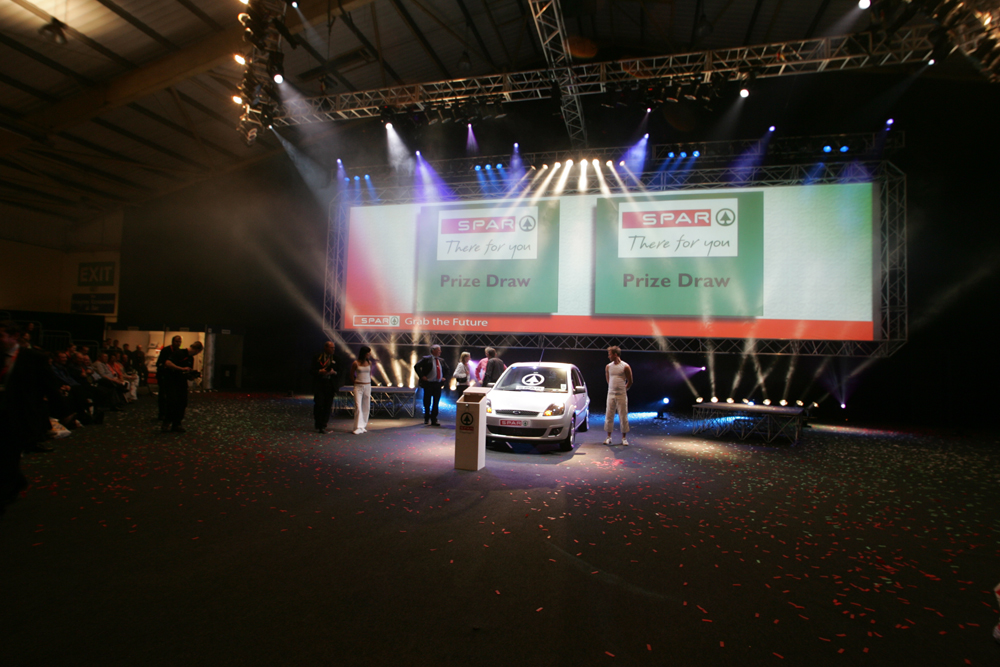 QED provided a massive ultrawidescreen system for Spar Supermarkets' trade show at the Westpoint Centre, Exeter. Organised and produced by Plymouth based production specialists Pyramid Presentations QED provided the ultrawidescreen equipment and expertise as well as three of the new 12,000 ANSI lumen Sanyo XF46 LCD projectors.The three XF46s threw nearly 36,000 ANSI lumens of brightness onto the 60ft wide 2842 x 768 pixel resolution ultrawidescreen canvas. With such a large screen and with such an extensive lighting system the very highest brightness was required in order to ensure that the spectacular lighting and show effects did not need to be compromised.