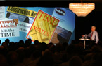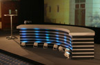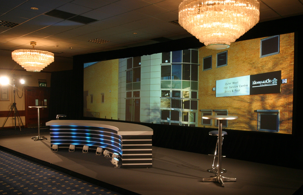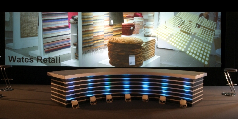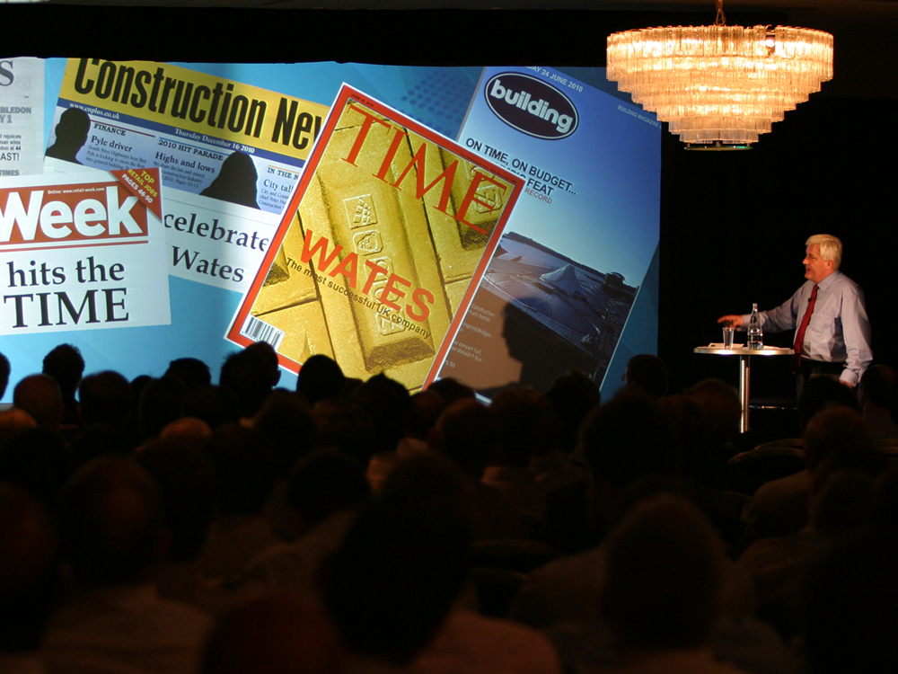 QED used its ultrawidescreen system for a four day roadshow for Wates Construction in several venues across the country.The flexibility of using a screen and drape system enabled the same show to be produced in a number of very different venues. Being able to adjust the overall height and width of the backdrop to suit each particular room was one of the keys to its success, and entirely eliminated the need for a conventional backdrop set.
