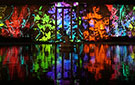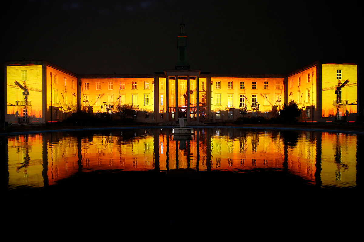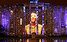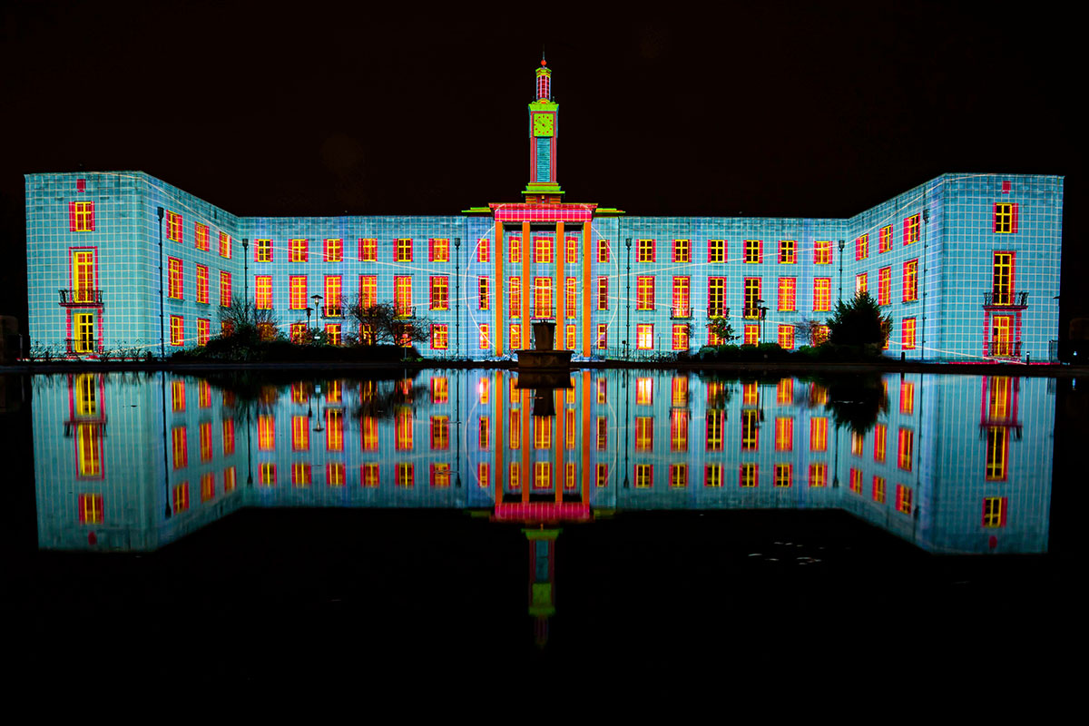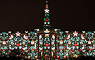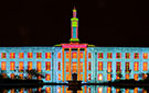 "The Town Hall is an extraordinarily impressive art-deco style building set in spectacular grounds, so we were most keen to exploit its full potential and to totally transform it" said QED Director Paul Wigfield. "We decided to use twelve Panasonic 30,000 lumen RZ31K projectors running in portrait mode to cover the front faces of the building, as well as all three visible sides of the clock tower." Extremely precise projector placement and 3D modelling was required to enable full coverage of all the different surfaces in order to fill in the area behind the central columns. By separating the columns and the facade in the template design QED was able to create a seamless canvas for the imagery to flow across, whilst still allowing content to wrap around the pillars.