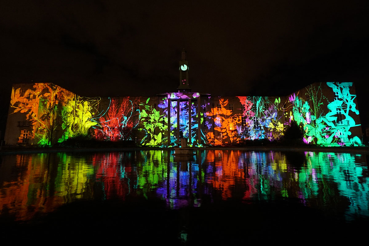 "Into the Forest" was preceded in the programme by another projection piece specially created for Waltham Borough of Culture by Addictive TV. Based upon their pioneering "Orchestra of Samples" a large number of local musicians from across the borough playing all manner of instruments were recorded, sampled and put together to create a new piece of music, which was then projected onto the town hall as if they were actually playing together.